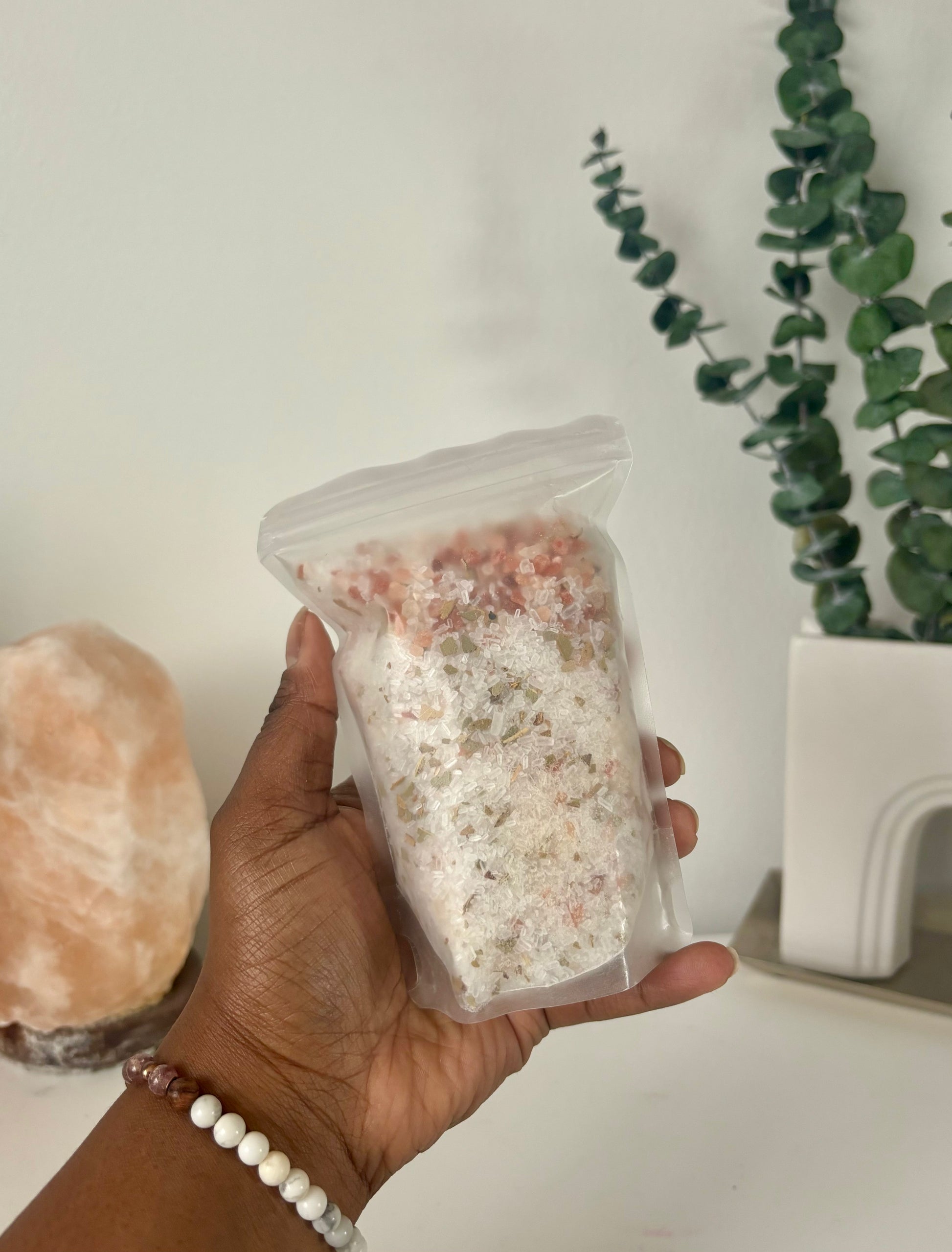 Epsom Salt, Himalayan Salt, Oat Milk Powder, Lavender-Lemongrass, Eucalyptus, Essential Oils.