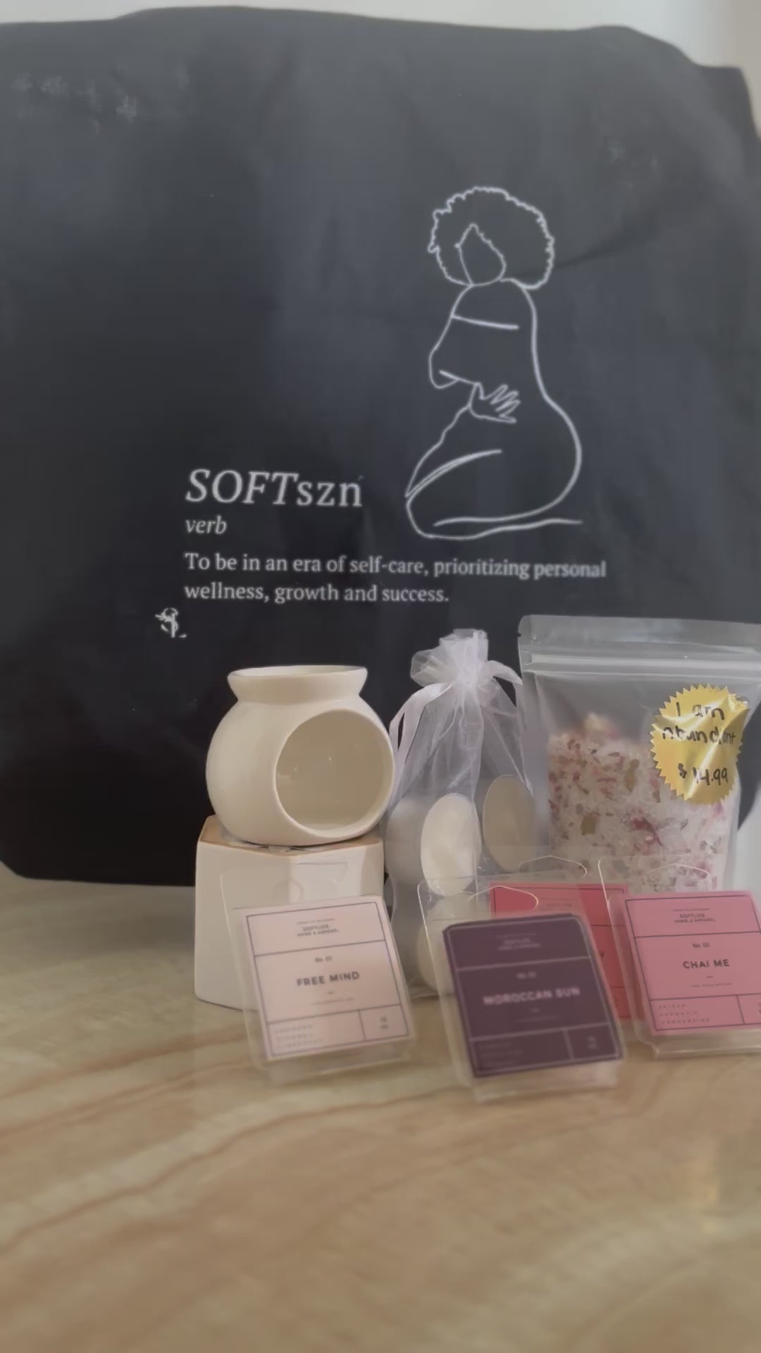 - Our mini candle wax melter, 4 tea lights, and four mini-sized cubes of our signature organic clean-burning coconut-soy wax scents: Free Mind, Milk & Honey, Chai Me, and Moroccan Sun perfect for creating a serene atmosphere for relaxation.